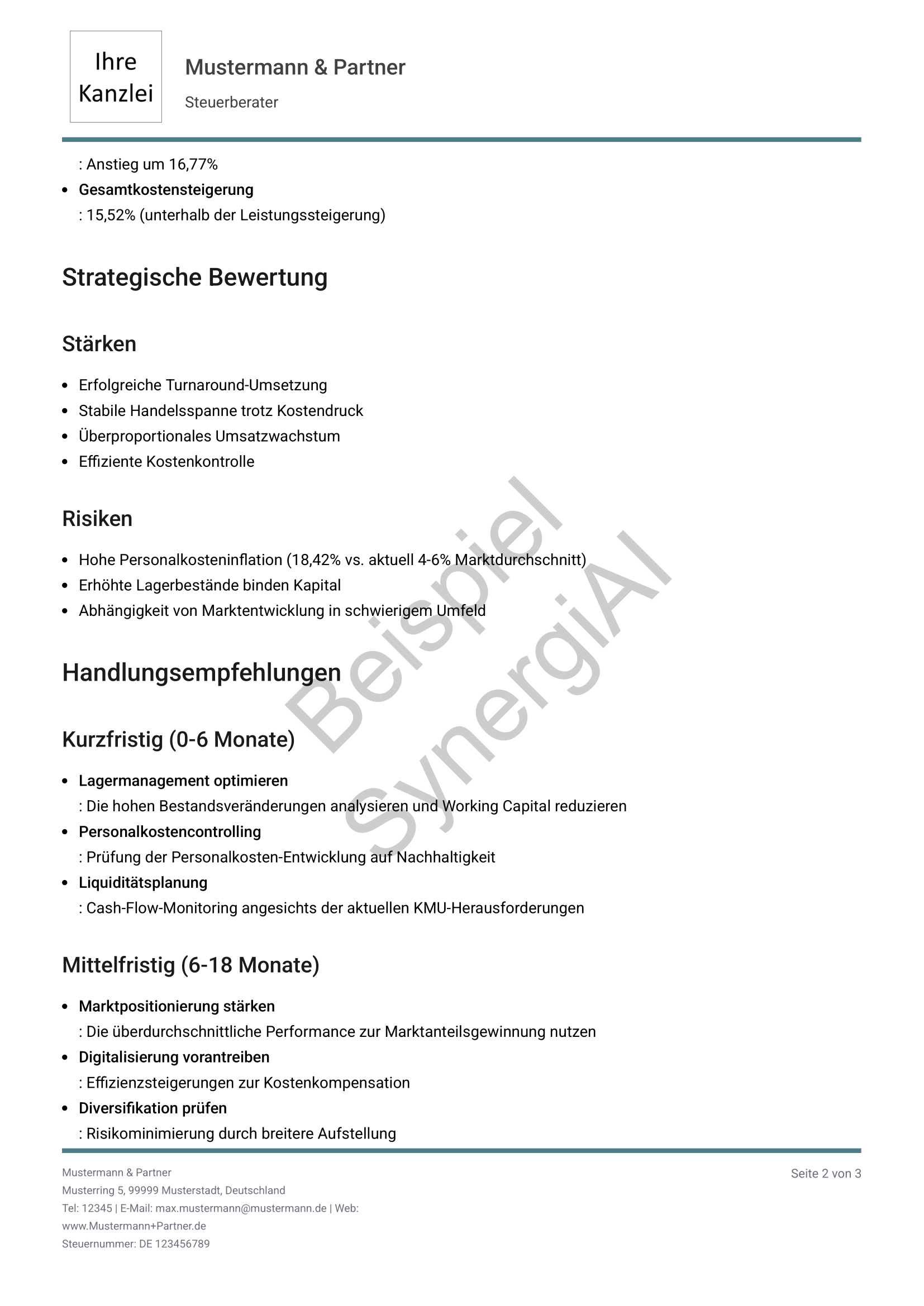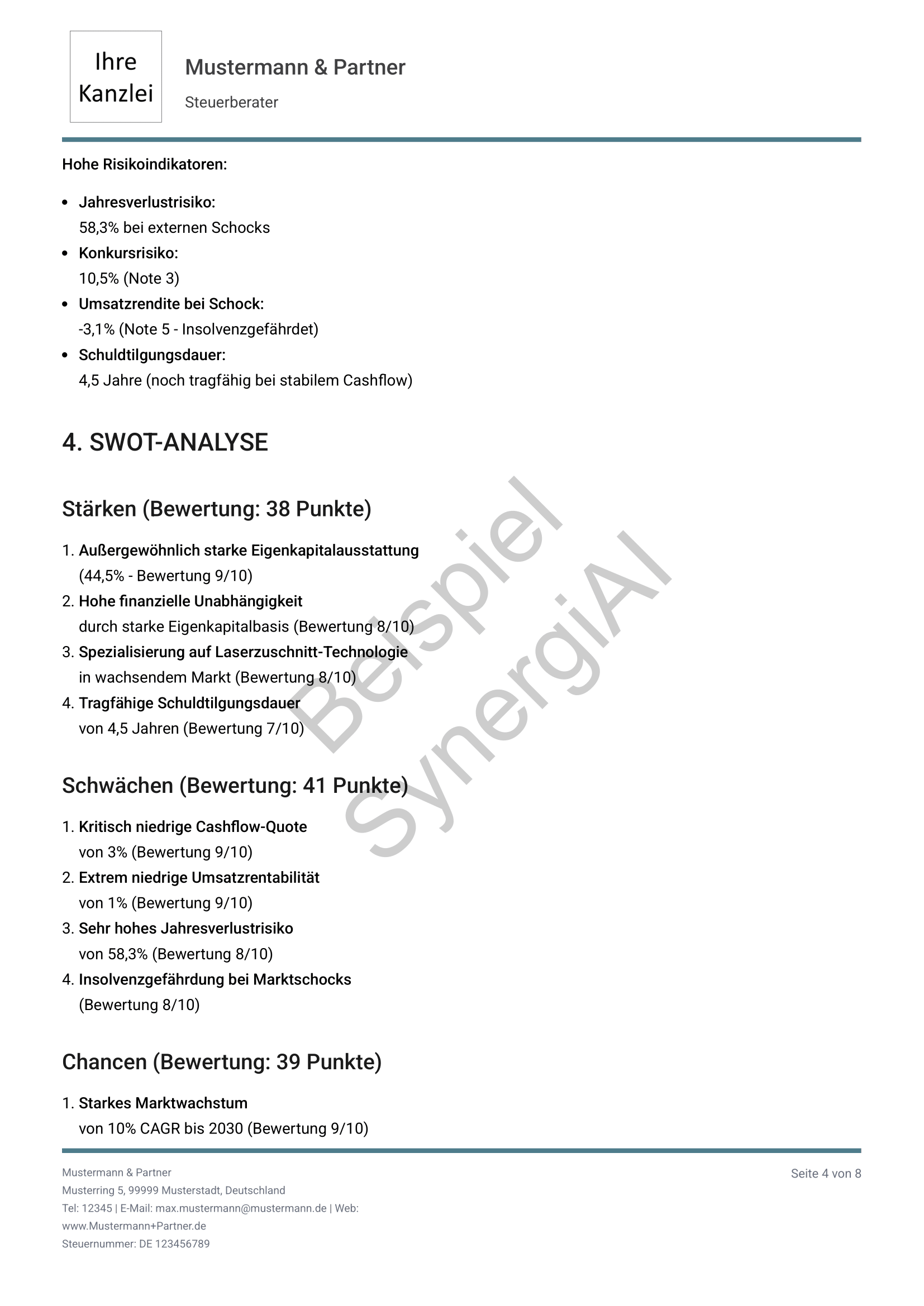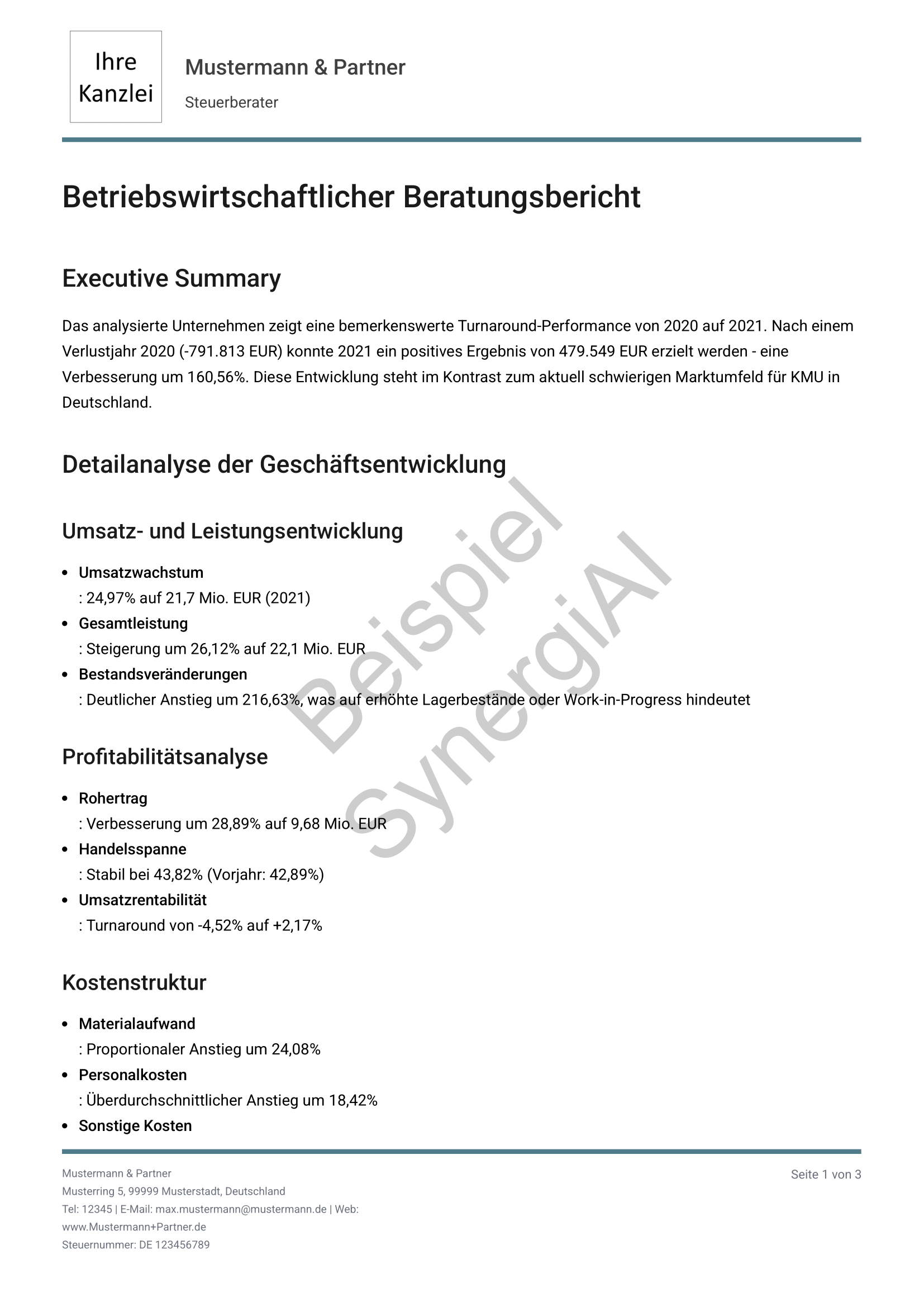 Export als PDF für Mandanten, Banken oder interne Dokumentation. Sie führen das Gespräch, SynergiAI liefert die Entscheidungsgrundlage.