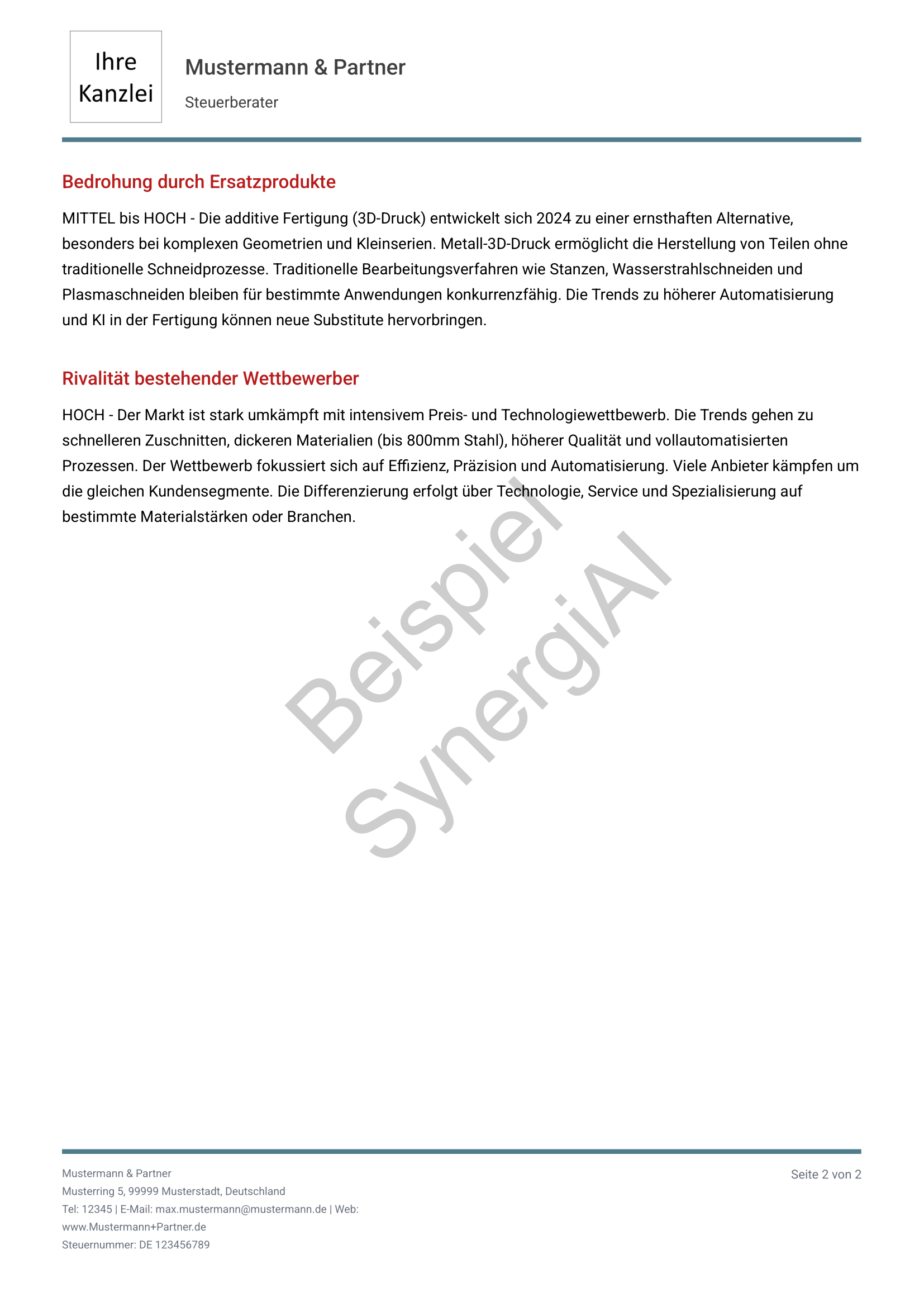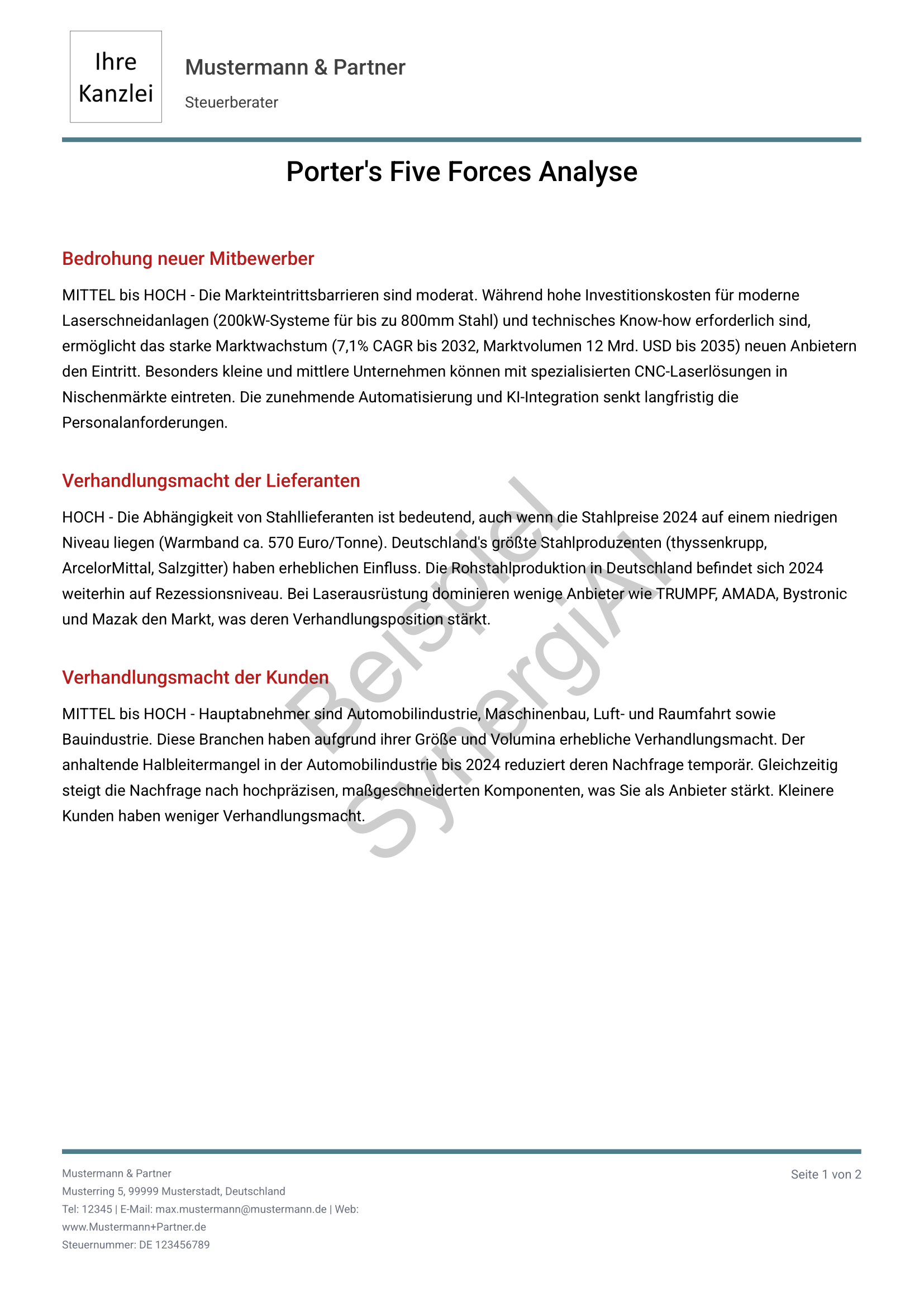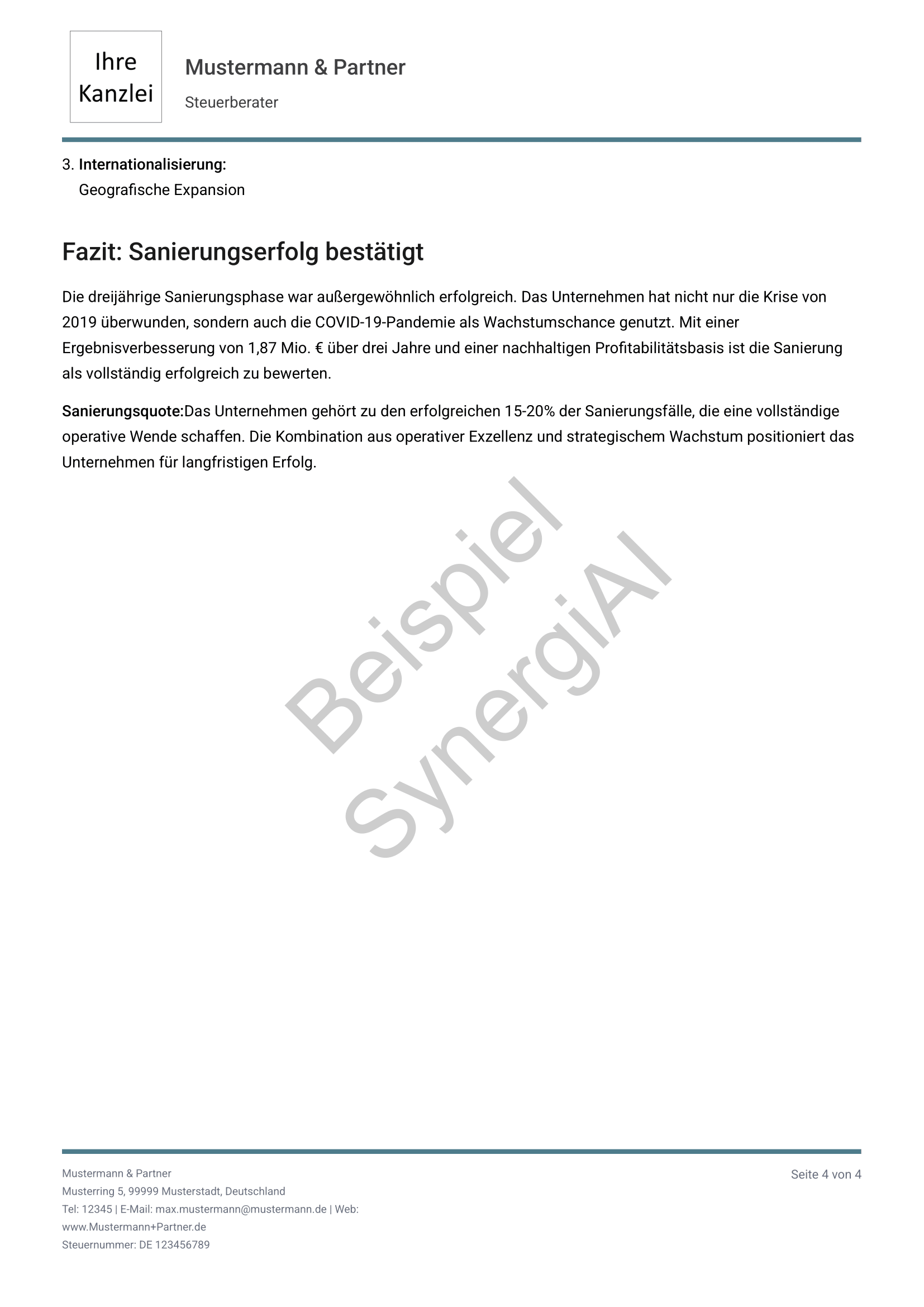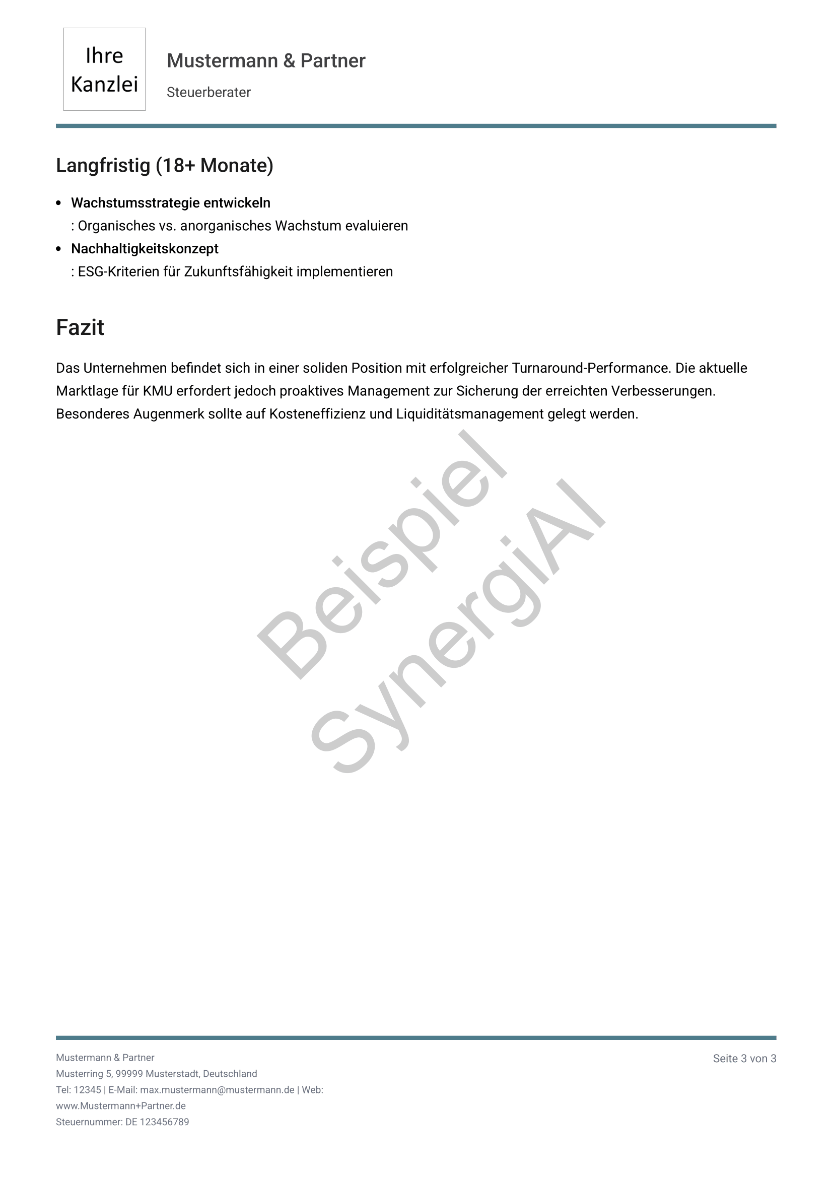 Export als PDF für Mandanten, Banken oder interne Dokumentation. Sie führen das Gespräch, SynergiAI liefert die Entscheidungsgrundlage.